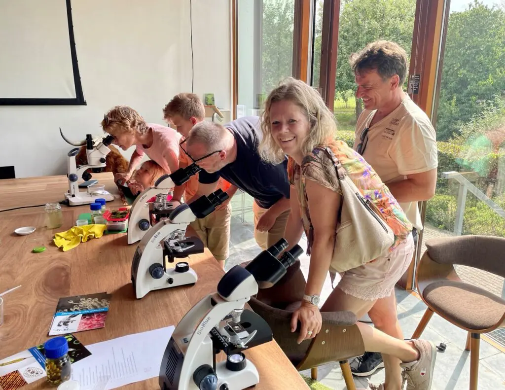Uitleg over wat je onder de microscoop ziet en over de werking van de microscoop horen bij de workshop.