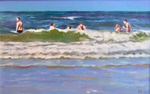Deze keer vond ik het een uitdaging om op klein formaat een zo groots onderwerp als de zee te schilderen. In eerste instantie ging ik voor de golven, tot ik zag hoe mensen in de golven een interessante toevoeging werden. Daarbij zijn mensen op een zonnige dag in de golven ook mooie lichtvangers. In totaal zijn er 15 schilderijen te zien, waaronder grotere werken.