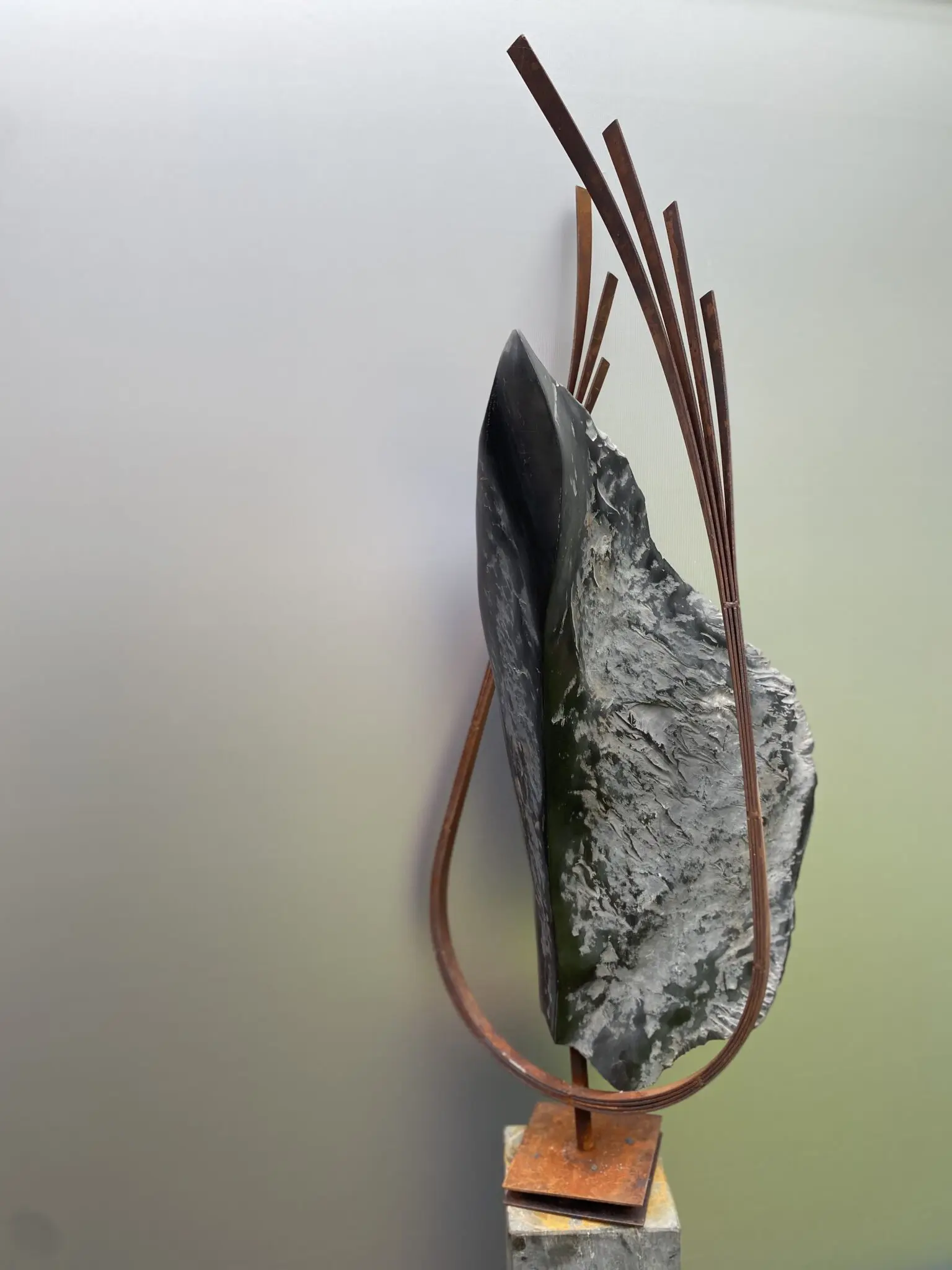 Staal is hierbij zeer geschikt materiaal. De vorm begint in de steen. Enerzijds door zijn oorspronkelijke vorm maar ook doordat hij hem met hamer en beitel bewerkt. De beweging die in de steen ontstaan is zet Hans met staal door de vrije ruimte in. Daarmee toont het werk behalve wat er in de steen gebeurt ook wat dit doet met zijn wijdere omgeving. Hiermee introduceert hij een monumentale benadering. Naast zijn nieuwe werk in steen en staal blijft Hans werk maken in uitsluitend natuursteen. Echter krijgt dit nu meer een monumentale waarde dankzij het proces wat hij met steen en staal doormaakt.