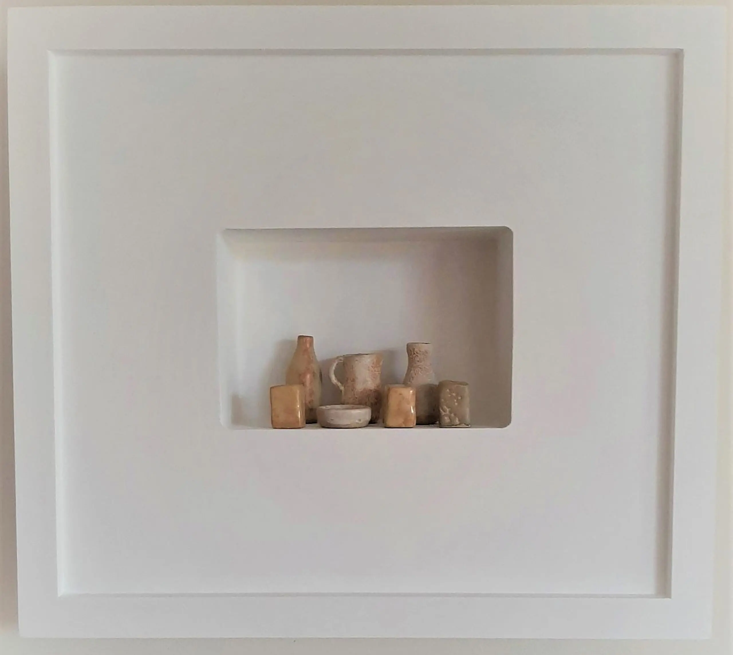 In haar collectie ‘klei stillevens’ bracht ze een hommage aan Morandi door de keramische stillevens uit zijn schilderijen weer in keramiek terug te vertalen en te plaatsen in 3D schilderijlijsten.