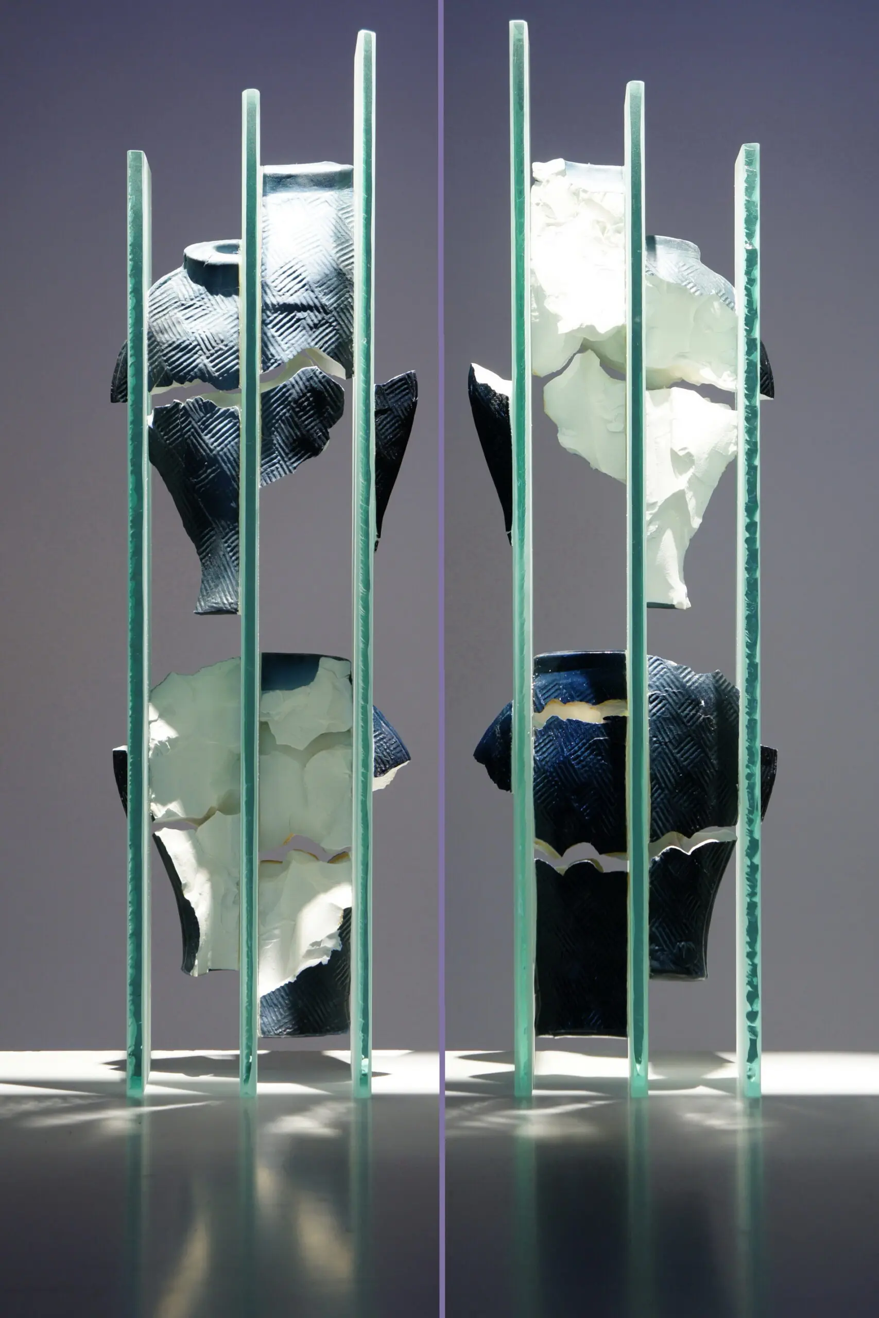 Ik toon een nieuwe serie werken die het schip in tijd en ruimte volgen. Gefragmenteerde vaatvormen van massief porselein/steengoed, soms gemonteerd tussen glazen kolommen.