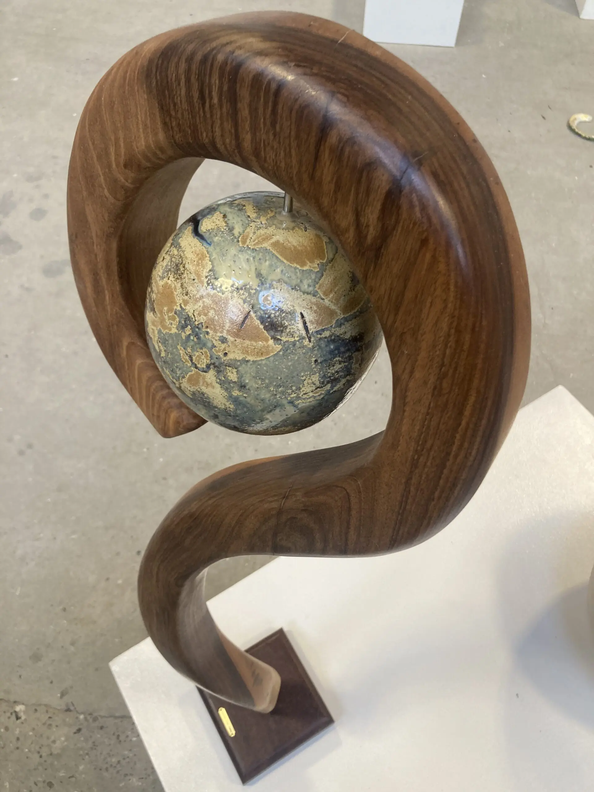 Het nieuwe in de uitdrukking van Morten, zoals blijkt uit de hier tentoongestelde werken, is dat hij combineert hout met keramiek.