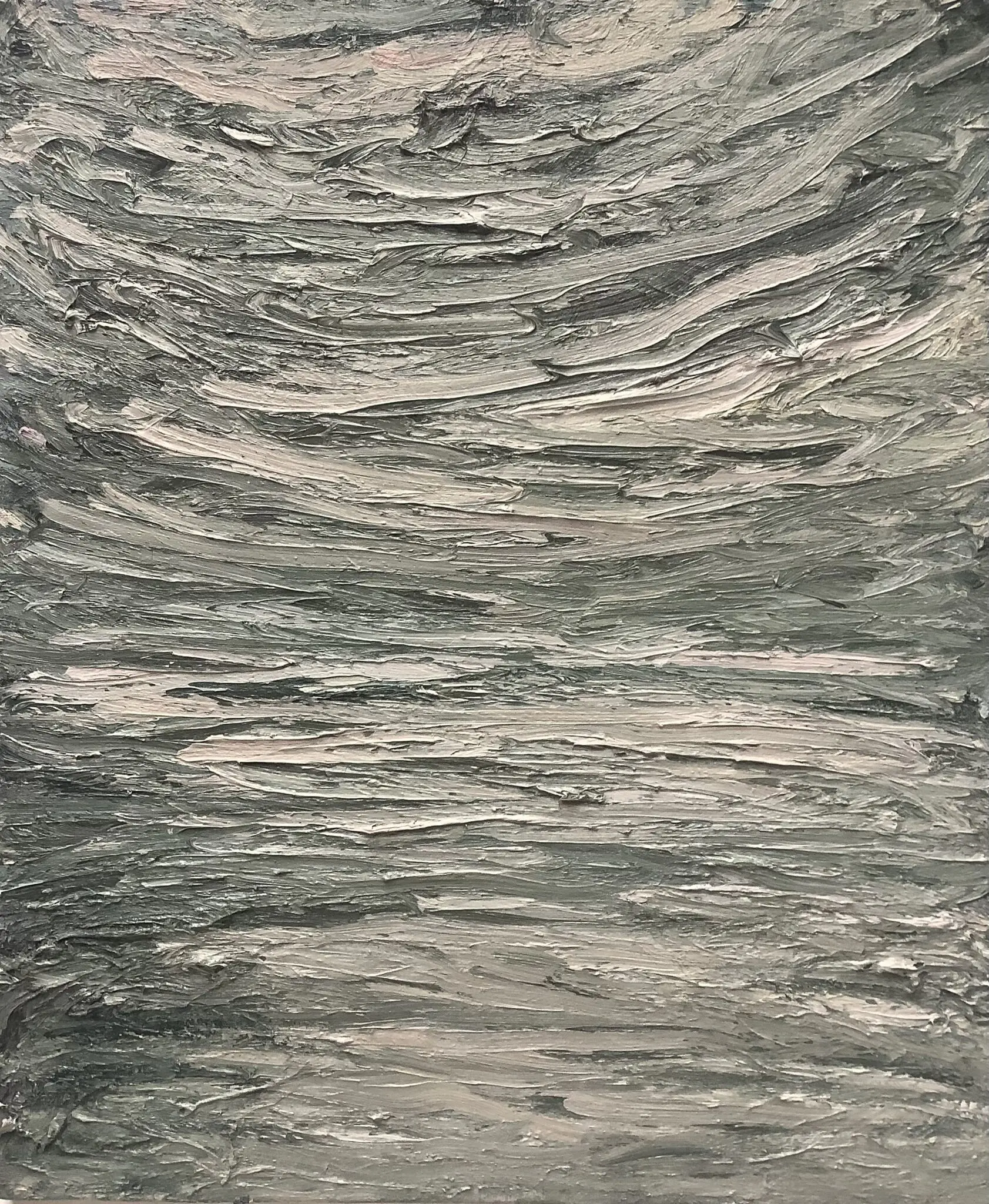 Dit jaar begon ik met een schilderij naar aanleiding van één van de schetsen.  Er ontstond een doek in grijs-groene en roze tinten.  Lucht en water vloeien in elkaar over. Er is vooral een zinderend licht. Dit heb ik proberen te pakken. Het onderzoek is nog gaande,  ik ben nog niet klaar. Vanuit het ene schilderij ontstaat het andere. Het zijn zowel letterlijke als figuurlijke  spiegelingen; tijdens het maakproces kan je jezelf niet uitwissen.  Alles heeft invloed. Mijn schilderijen zijn in feite landschappelijke zelfportretten. Het gaat erom dat je op het juiste moment handelt en heel zeker en energiek schildert wát je moet schilderen.